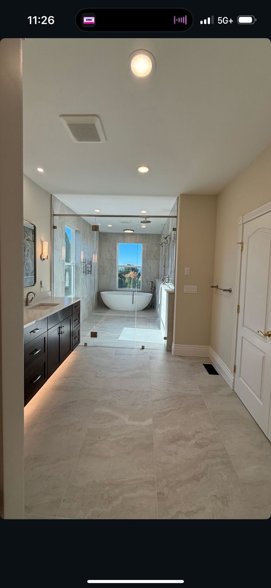 Complete bathroom remodel turned into a true sanctuary. A sleek freestanding vanity brings airy elegance, while the showpiece is the expansive walk-in wet room: a luxurious freestanding tub sits inside the large shower area, paired with a separate rain showerhead. A sleek full-height glass door elegantly separates the wet zone from the rest of the room. Spacious, serene, and stunning—the owners now start and end every day feeling like they’re at a five-star resort.