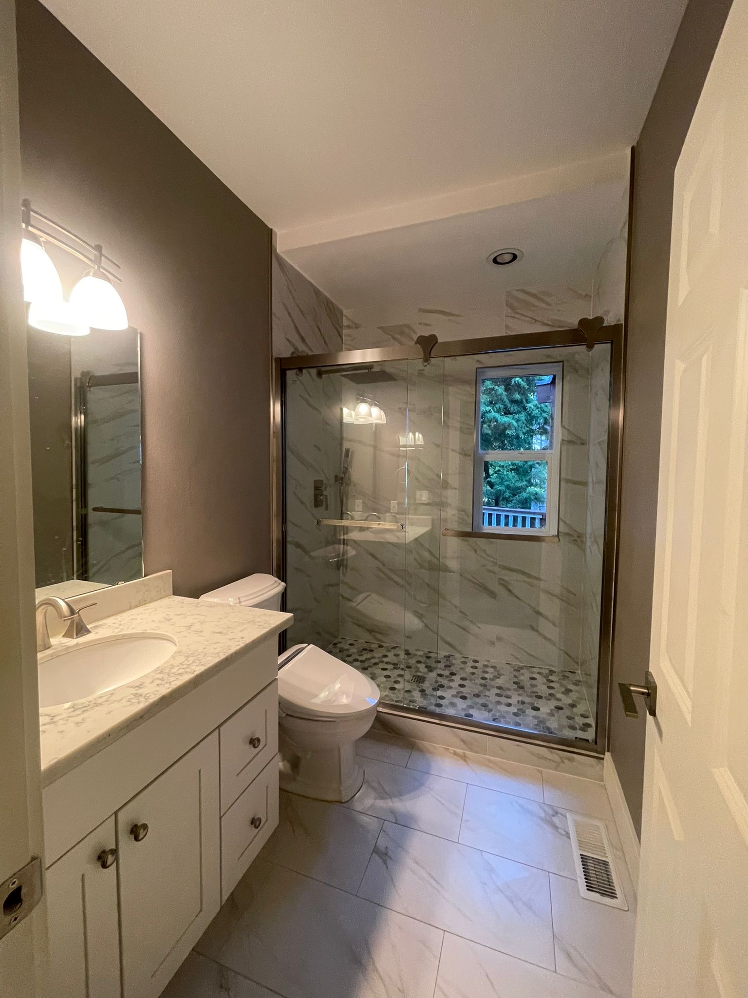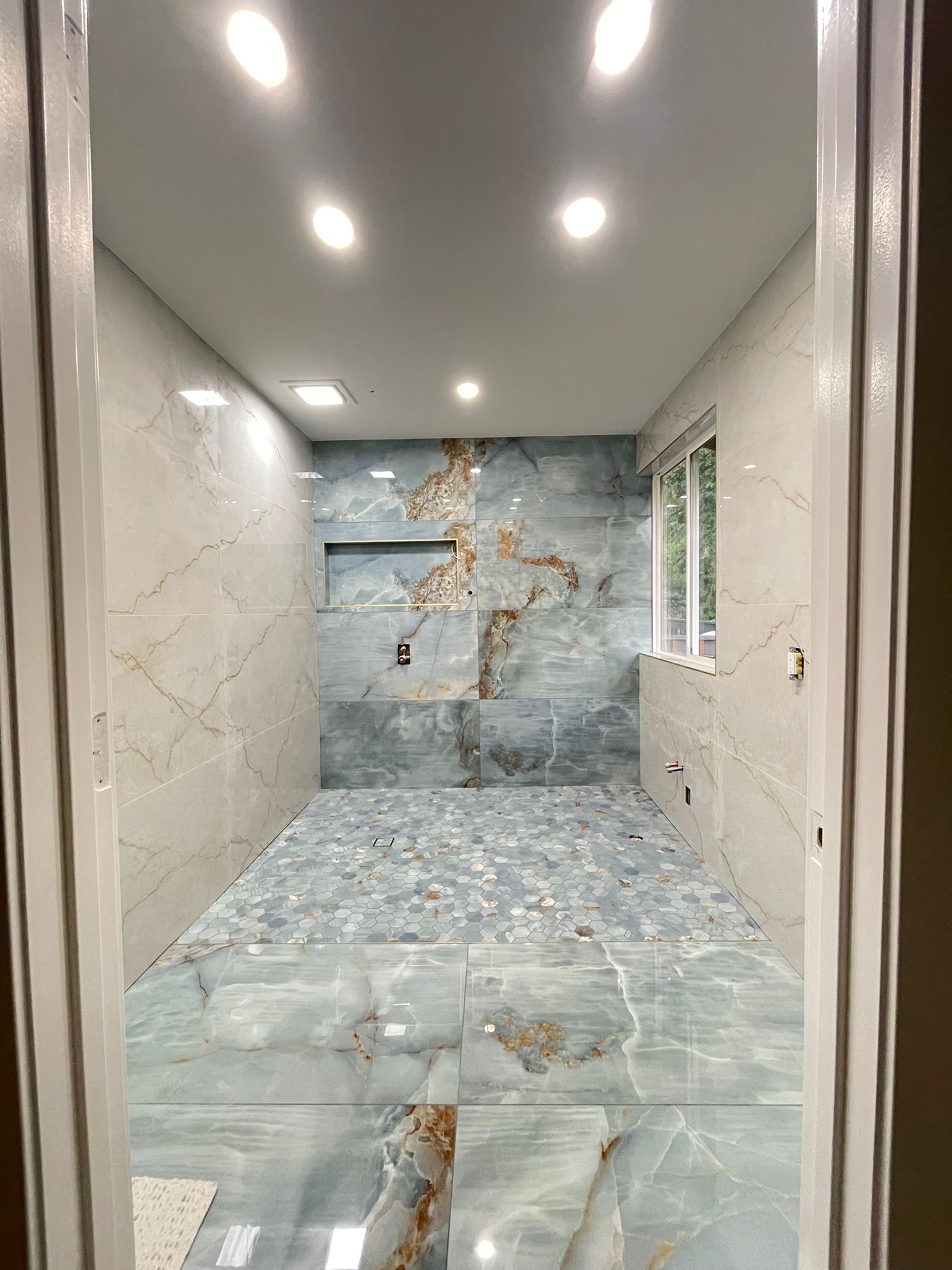 A full master bathroom remodel featuring a spacious walk-in shower finished with beautiful tile. The updated surfaces create a warm, inviting look, and the open shower design gives the room a modern, comfortable feel.