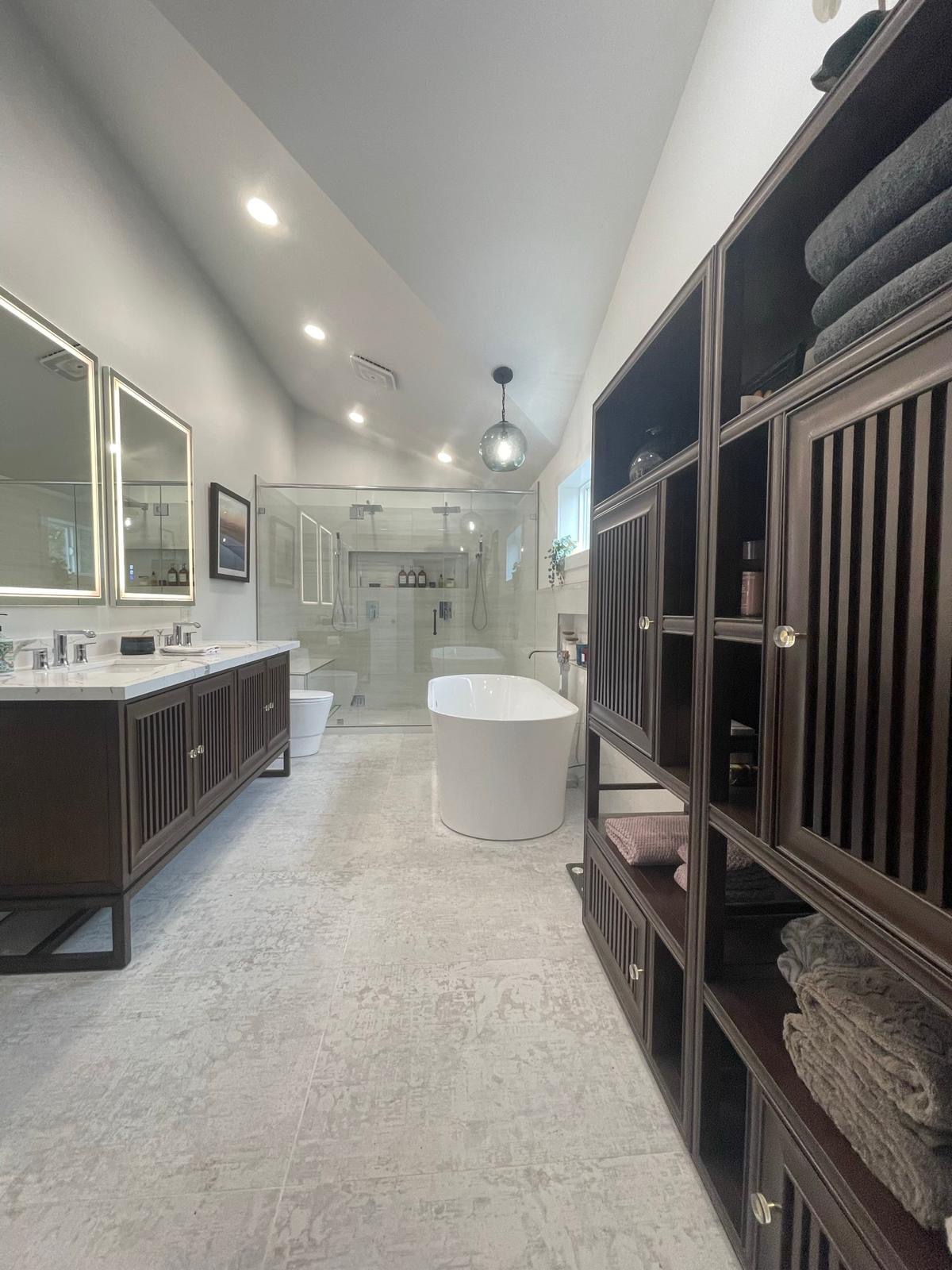 This complete master bathroom remodel creates a spa-like sanctuary with elegant dark brown vanity and beautiful cabinet on the right for generous storage. At its heart: a luxurious freestanding tub and an expansive dual shower with room for two, featuring dual showerheads and rainfall fixtures. Timeless design, premium materials, and soft lighting blend style and function—perfect for couples seeking daily indulgence in their private oasis.