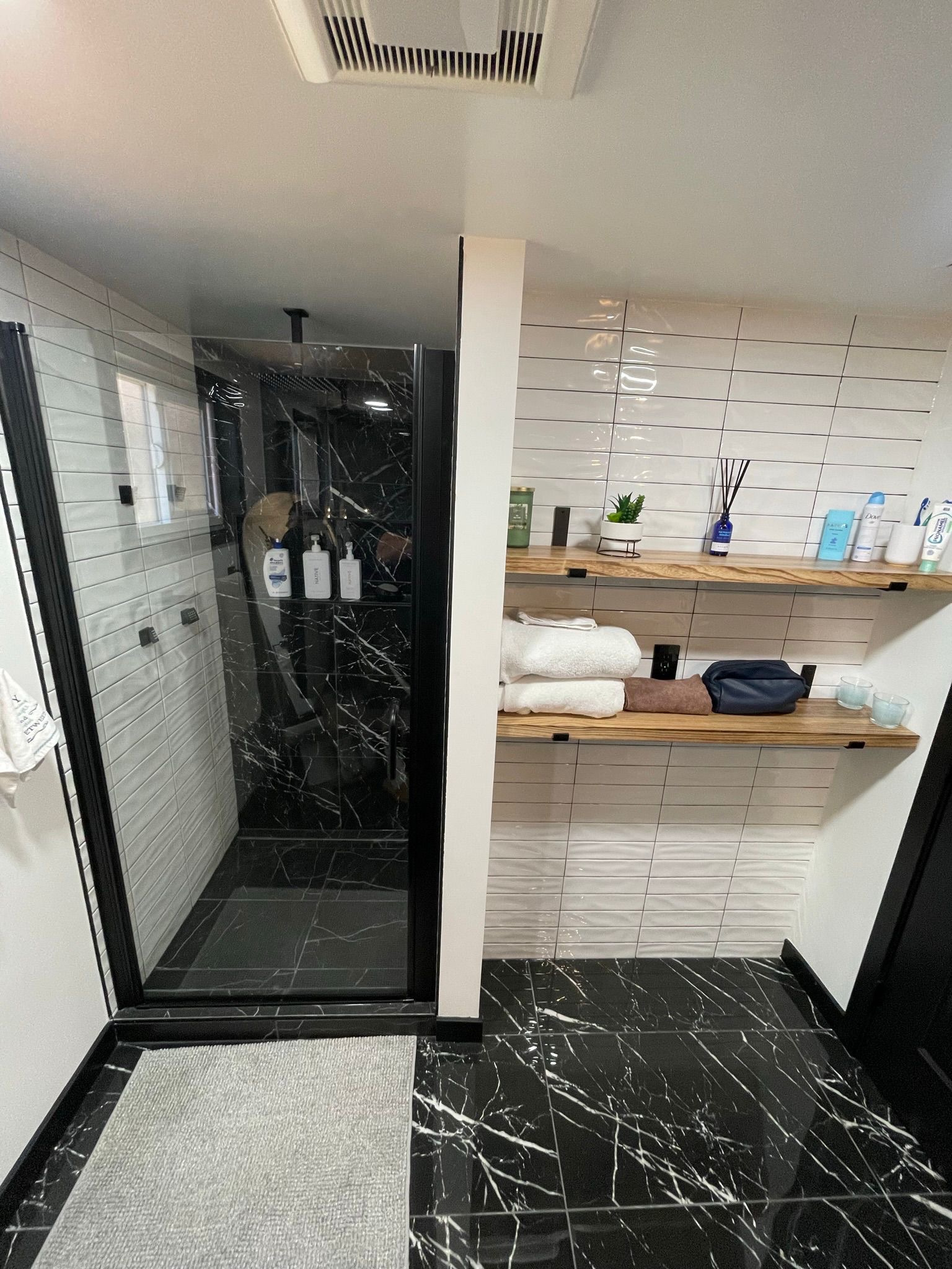 Fresh guest bathroom remodel featuring a new 3x3 ft shower with simple white tiles, and beautiful accent wall with black tiles and white veining. The radiant heated floor is for added, cozy comfort, and two warm wooden shelves for storage and style. Clean, modern, and inviting—perfect for making every guest feel pampered.
