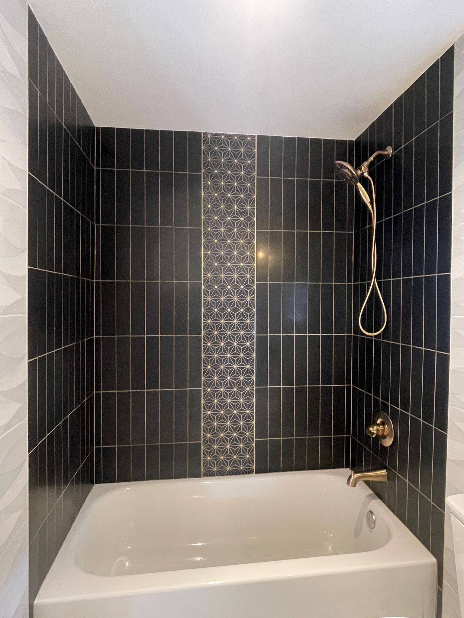 This fully remodeled bathroom is pure drama and elegance. Stunning black tiles set the mood, while a jaw-dropping full-height mosaic feature wall steals the show. Gold fixtures throughout add warmth and sophistication, turning every shower, faucet, and accents. The result? A sleek, modern sanctuary that feels like a high-end hotel spa—every time the owners step inside.
